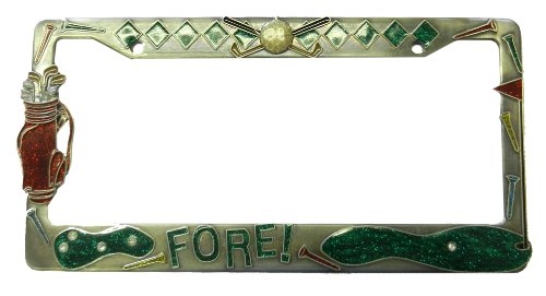 Golf Players Fore! Script w/ Golf Ball & Set of Clubs w/ Green Car Truck SUV Chrome License Plate Frame Guide